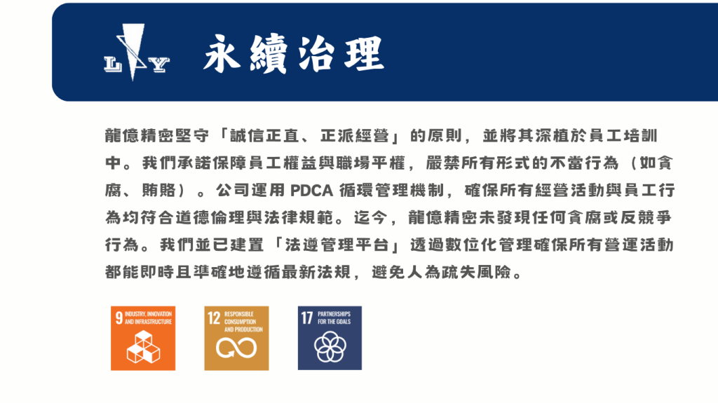我們在保障員工權益與職場平權的同時,以零容忍的態度杜絕貪腐、賄賂等一切不當行為。公司營運的合規性,則藉由PDCA 循環管理機制持續優化,確保決策符合道德倫理與法律要求。